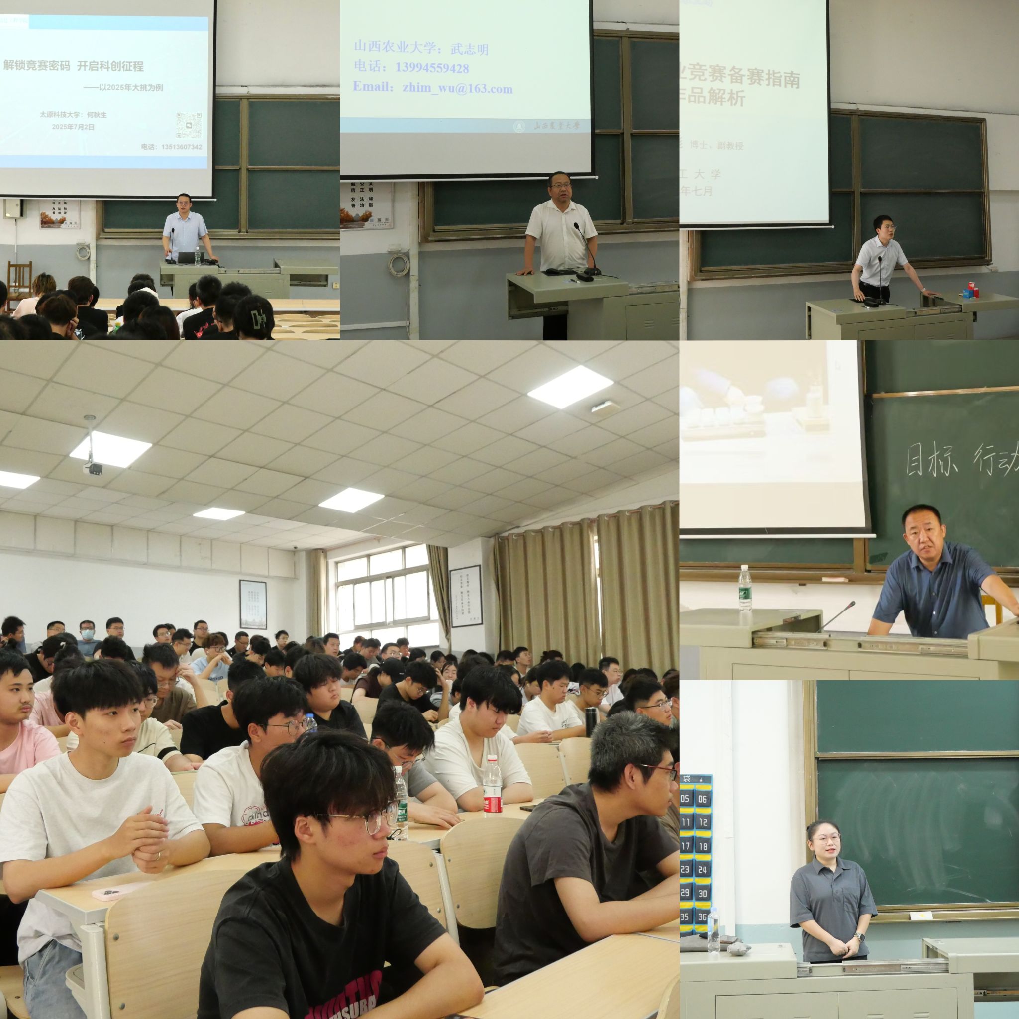 此次讲座特别邀请各校专家主讲,分别是2138cn太阳集团古天乐电子信息工程学院何秋生教授、山西农业大学农业工程学院武志明教授、太原理工大学2138CC太阳集团谢彪副教授、中北大学国际教育学院刘宝华副院长、中北大学环境与安全工程学院黄鹊副教授。各位专家结合自身教学科研经历与多届竞赛指导经验,围绕学生创新创业需求,依次带来“解锁竞赛密码、开启科创征程”“四新背景下高校大学生的创新与创业”“科技类创新创业竞赛备赛指南与优秀作品解析”“致知于行谋未来”“聚焦安全交叉学科竞赛:如何高效备赛、突出重围?”五场精彩讲座。讲座中,专家们通过案例拆解、技巧传授、经验分享等方式,将竞赛知识转化为具象的实践指导,内容兼具专业性与实用性。